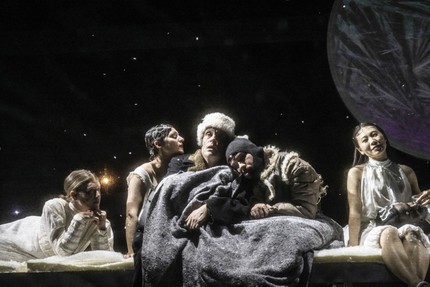 Неслучайно сценография спектакля вырастает из образа главного рождественского сувенира — стеклянного шара, внутри которого бесконечно кружатся снежинки. Этот символ пленённой стихии погружает зрителя в замкнутый мир иллюзий, из которого нет выхода, в котором возможно только сосуществование оказавшихся внутри фигурок, домиков, ёлочек и зверушек.