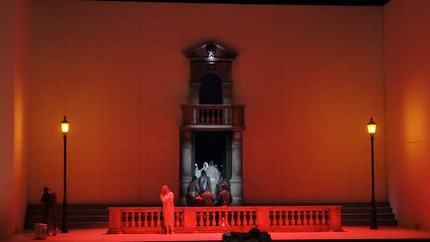Пространство спектакля становится театрализованным контейнером для музыки в серо-бело-красном освещении художника по свету Феличе Росса.