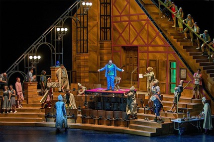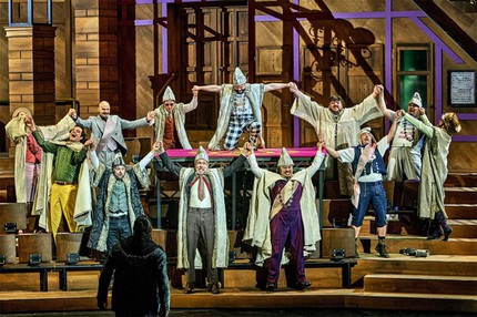 Костюмы Сюзанны Хубрих словно сняты с героев детского представления по мотивам «Белоснежки и семи гномов», а сценография Эндрю Эдвардса, состоящая из вращающегося полу-конуса, своей примитивностью иллюстрировала проходящий через всю вагнеровскую партитуру мотив беззаветной туповатости самых широких слоёв «великого немецкого рейха».