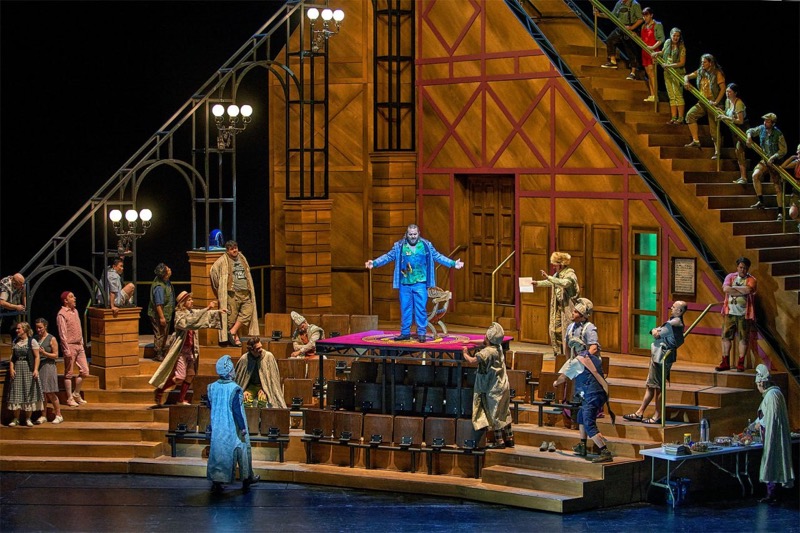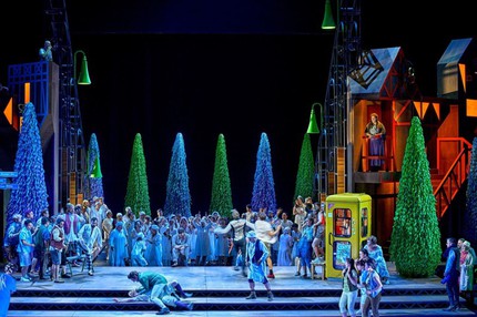 По случаю визита на фестиваль бывшего канцлера ФРГ Ангелы Меркель премьерная публика долго не могла успокоиться, фотографировалась, рассаживалась уже после начала увертюры, слепила экранами телефонов. И на сцене мы увидели целых две пародии на А. Меркель, и на средневековую немецкую архитектуру, и на телешоу с солнышком из лампочек, и Еву в платье, напоминающем сельскую клумбу, и гигантскую радужную надувную корову с эрегированным выменем.