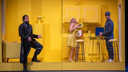 Нетрудно догадаться, что постановщики не оставили «Турка в Италии» в том времени, которое предусмотрено в оригинале, а перенесли действие в современность: Роберто Каталано выбирает для оперы Россини эпоху необузданного потребления, которая ассоциируется с ярко-жёлтым цветом. Но в гамме цветов, выбранных Гвидо Буганса и Иларией Арьемме, помимо жёлтого, есть и синий в «химической» версии, если можно так сказать, и их живое сочетание придаёт шоу жизнерадостный дух. Кофеварка жёлтая, как и элегантные наряды Фьориллы, неотразимой в своих пальто и шляпе: декорации, элегантные костюмы и аксессуары находятся в идеальной гармонии. Режиссура Роберто Каталано легко вписывается в эту яркую оправу, придуманные им остроумные трюки раскрывают ироничный и внимательный к человеческим слабостям взгляд на персонажей.