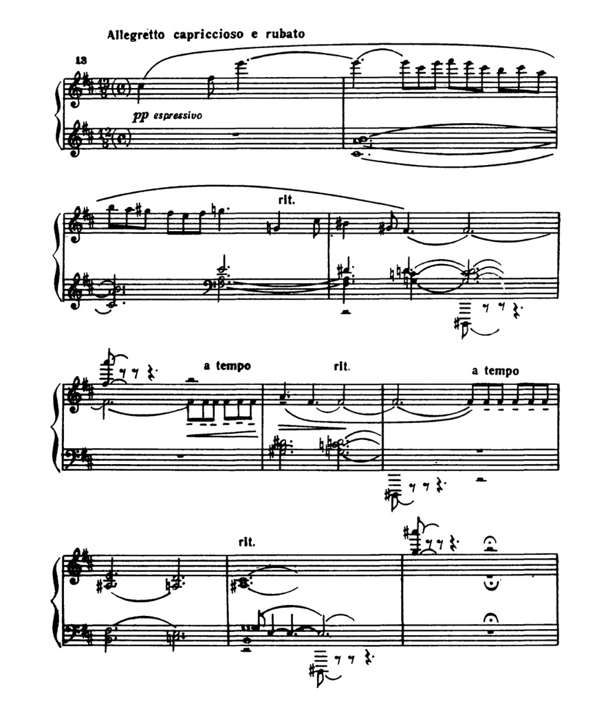 Замечательно на протяжении этой короткой, удивительно пропорциональной пьесы обилие тональных переливов. С первоначальным си мажором сразу же сопоставляется ре-мажорная фраза; после краткого отклонения в до мажор и новой реминисценции основной тональности возникает соль мажор, светлый колорит которого тут же оттеняется соль-диез минором, совпадающим с наиболее напряженным эпизодом. «Каденция» вновь возрождает мажорное звучание — сперва тональности, одноименной предшествующей, а затем возвращающей к основному строю пьесы — си мажору.