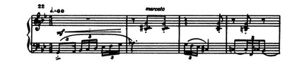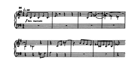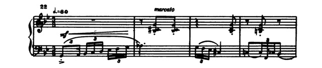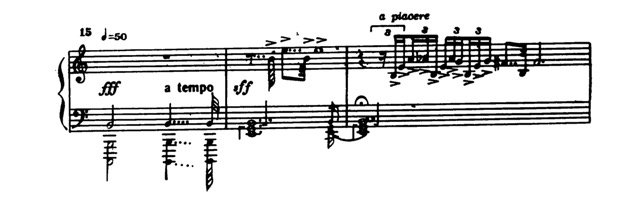 В следующем далее «Речитативе» вновь господствуют трагически-мрачные интонации басов, подобные неумолимому приговору: «Смирись, повинуйся!». Как бы противясь им, с огромной внутренней силой звучит «отповедь» упругих остро-пунктирных квартовых интонаций (несомненна преемственность их как с первой пьесой цикла — «Прелюдией», так и, особенно, с предшествующей частью — «Ostinato»):