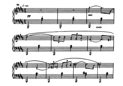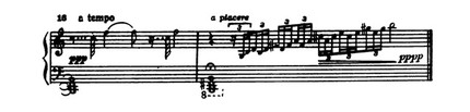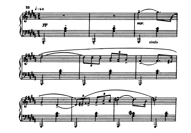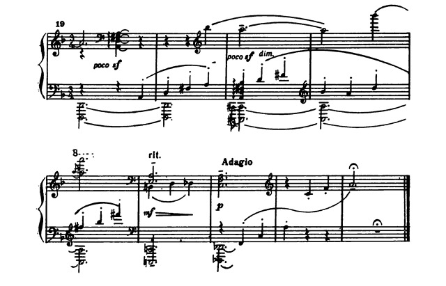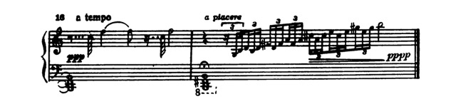 После максимального нагнетания неустойчивости непрерывного «брожения» удивительно неожиданно обретение в конце пьесы внутренней гармонии — призрачно звучащей тональности си мажор, которой внезапно разрешаются «импрессионистически»-зыбкие наслоения проходящих, словно воспаряющих ввысь терцовых ходов: