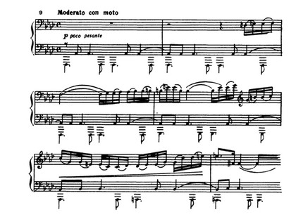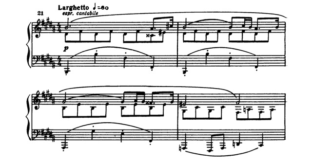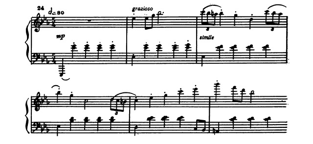 Трогательная, непритязательная песенность характерна для сменяющего «Интермеццо» «Романса», мелодия которого звучит на фоне, казалось бы, довольно традиционного, элементарного сопровождения чередующихся басовых звуков и аккордов: