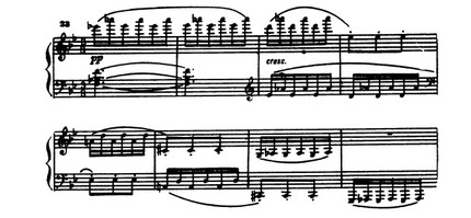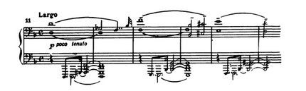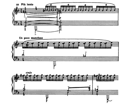 Мерное, торжественное развитие музыки, постепенное «обрастание» темы новыми контрапунктическими голосами внезапно сменяется зыбким, словно издалека возникающим трелеобразным движением шестнадцатых, пробуждая отдельные ассоциации с произведениями Мусоргского или Римского-Корсакова: