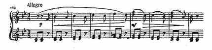 Для всех вообще пьес этого сборника характерны короткие штрихи и приемы позиционной техники, когда рука переносится с места на место в моментах паузирования или в перерывах между короткими лигами, сохраняя почти неизменное, первоначальное положение пальцев. Примером подобного позиционного перемещения, коротких штрихов и частого паузирования может служить такой тип изложения: