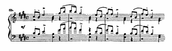 Нельзя не остановиться на замечательных приемах фортепианной инструментовки, использованных Чайковским для раскрытия своего замысла. В этом отношении особенно привлекает внимание первая тема с ее плавным, неторопливым движением. Это типично русская по своей ладоритмической структуре протяжная мелодия, характерная секундно-квартовыми ходами, равномерными ритмическими задержаниями на второй доле каждого такта и варьированным секвентным построением: